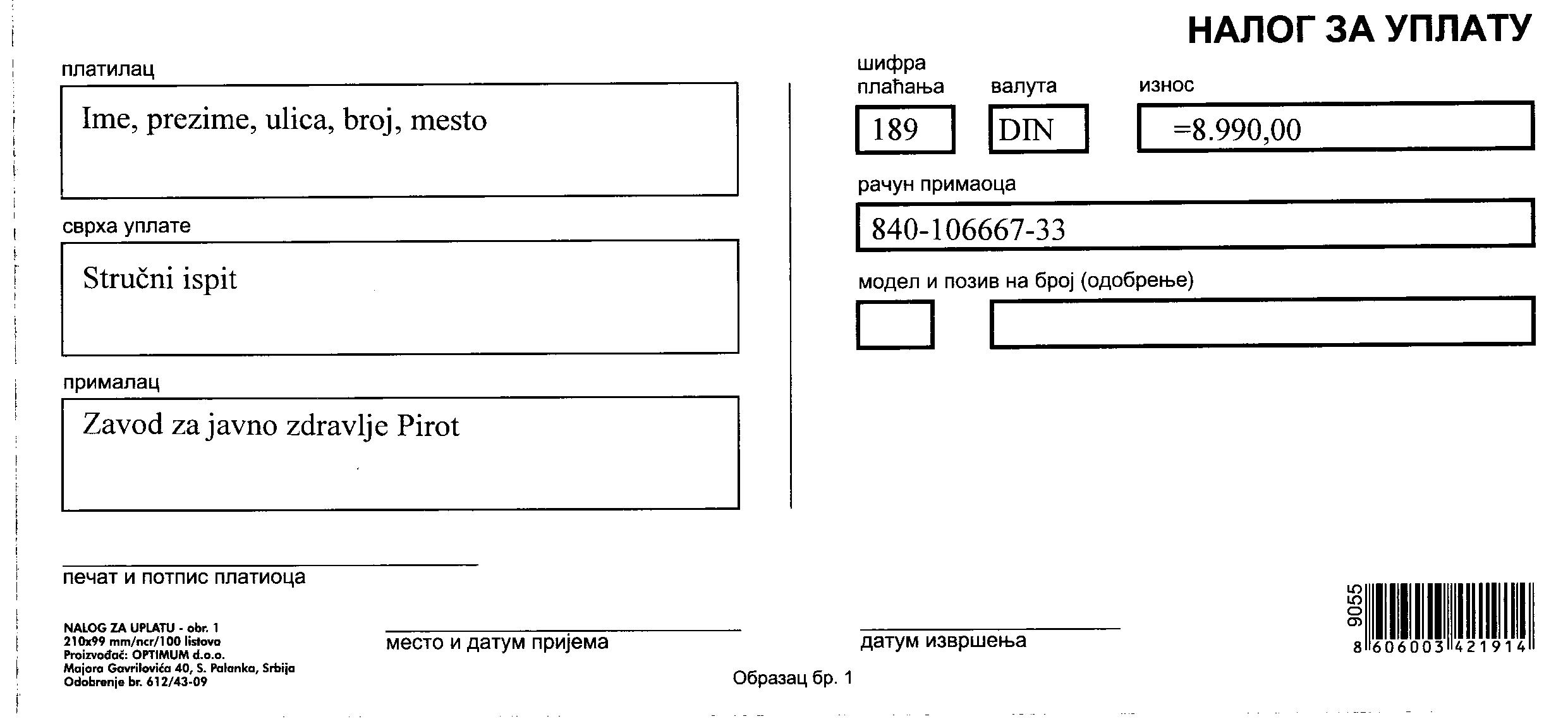 - potvrdu o uplati u banci ili pošti na žiro-racun Zavoda za javno zdravlje br. 840-106667-33 svrha uplate strucni ispit. Iznos od 8.990,00 može se uplatiti i na blagajni Zavoda za javno zdravlje Pirot